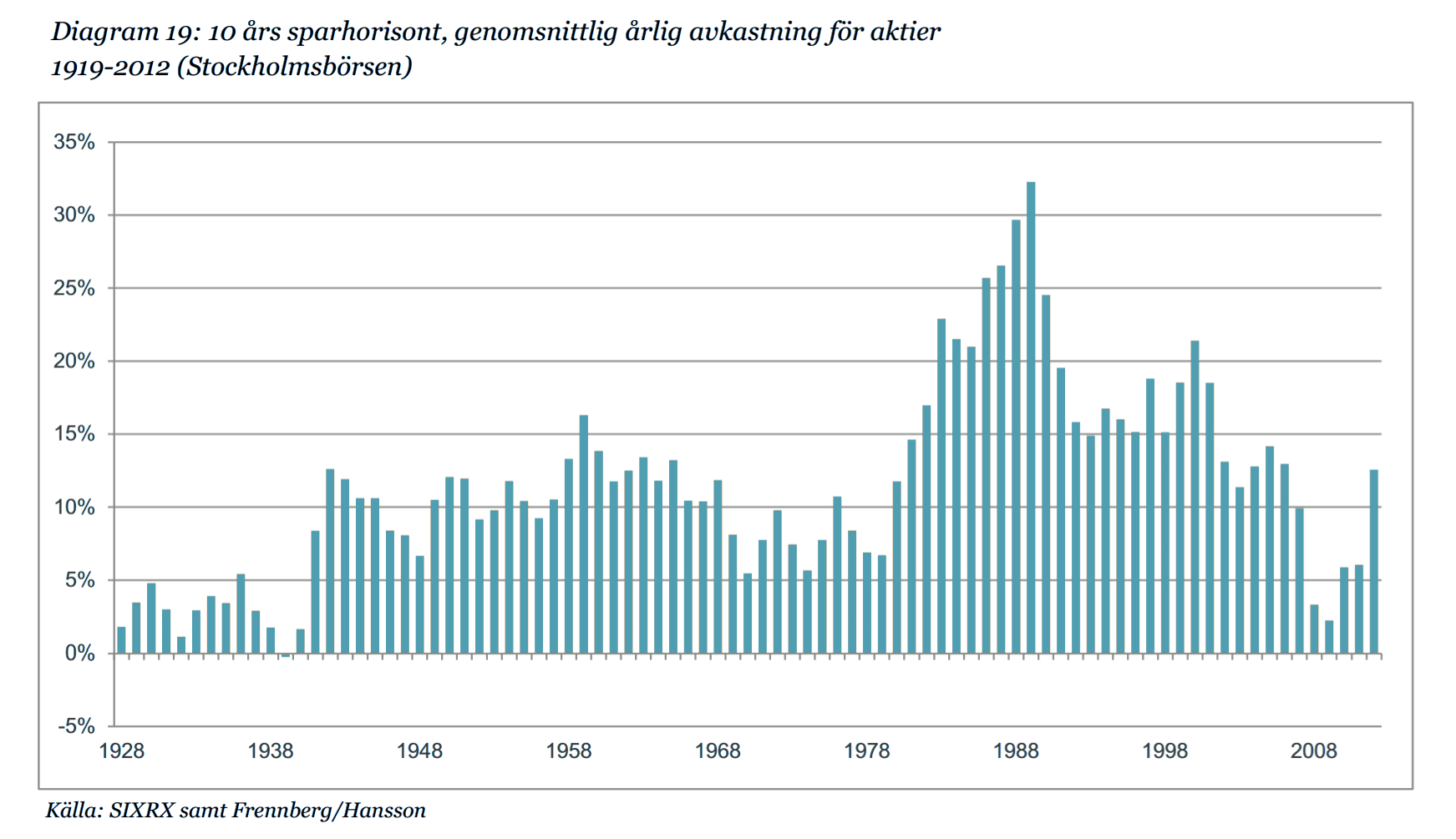 Diagrammet visar 85 st positiva 10 års-perioder och en tidsperiod (1930-1939) med en negativ avkastning på -0.2 % per år (nominellt). Staplarna visar alltså den genomsnittliga avkastningen per år för en tioårsperiod med start det året som stapeln är placerad på.