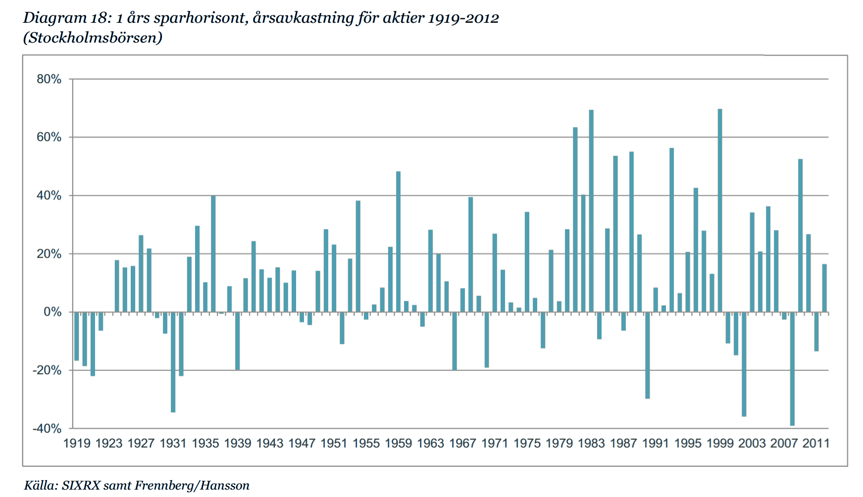 Om vi tittar på Stockholmsbörsens avkastning (SIXRX) under perioden 1919-2012 så ser avkastningen – för en 1-års investering vid olika årtal – ut så här: