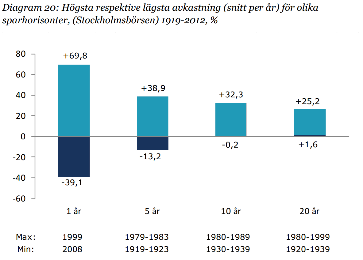 Nedanstående diagram visar högsta och lägsta avkastning i genomsnitt, för olika långa investeringsperioder.