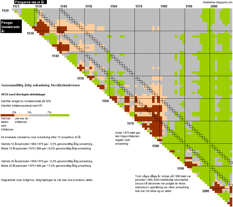 Hur du tolkar grafen är att du tittar vilket år du investerar pengarna i x-led och sedan har du dem inne fram till år Y i y-led. Färgen på rutan visar då den genomsnittliga avkastningen per år i perioden. Klicka gärna på bilden för att göra den större.