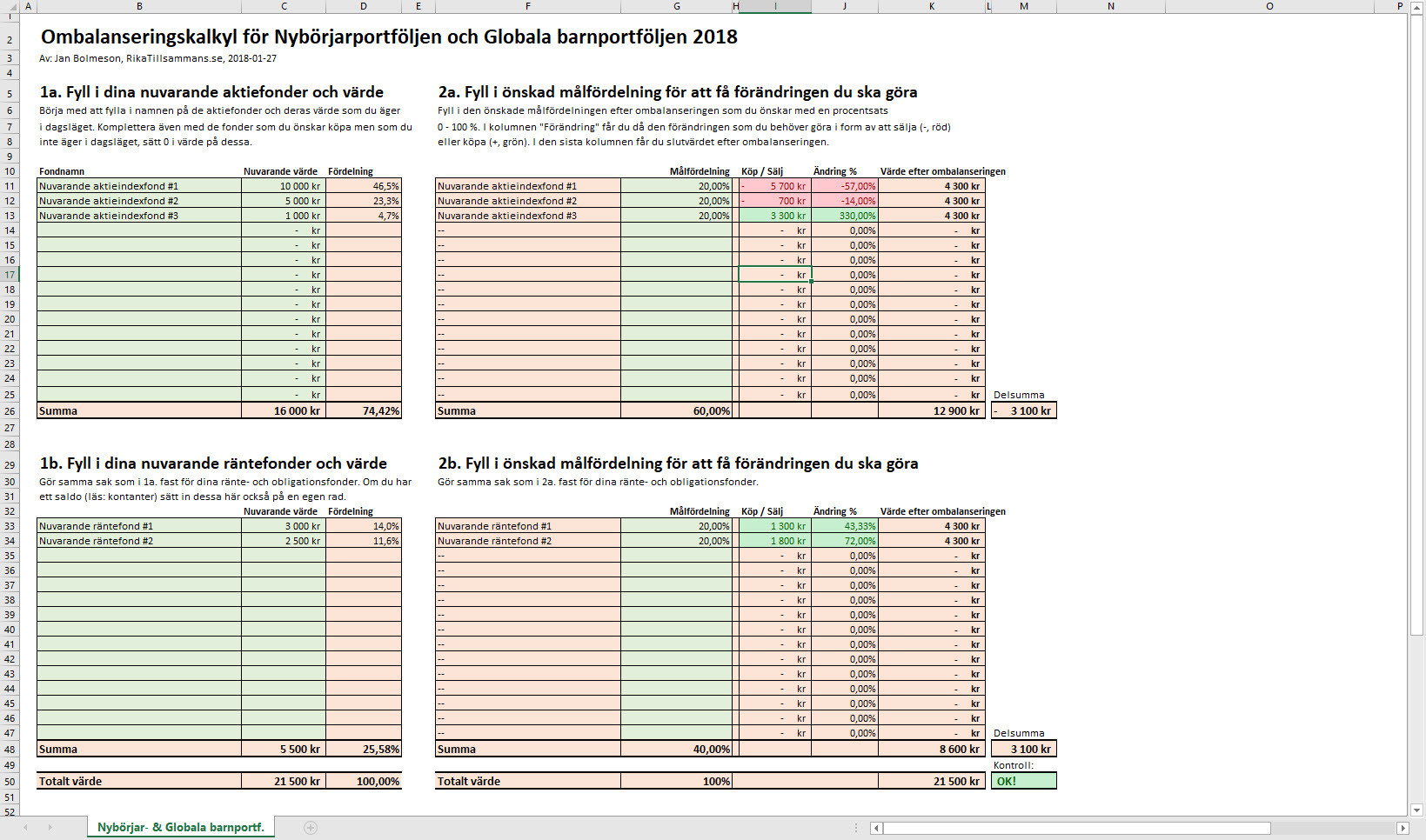 I mallen fyller du i dina fonder och deras nuvärde i de två första gröna kolumnerna, i den andra fyller du i önskad målfördelning för respektive fond och därefter spottar Excel-mallen ut hur mycket du ska köpa eller sälja respektive fond för.