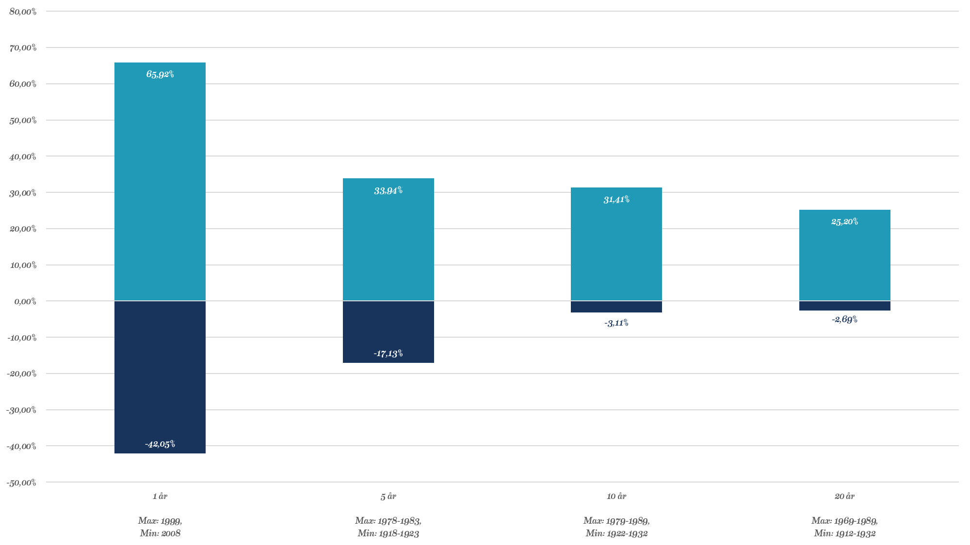 Bilden ovan visar den högsta respektive lägsta avkastning (snitt per år) för olika sparhorisonter för Affärsvärldens generalindex.