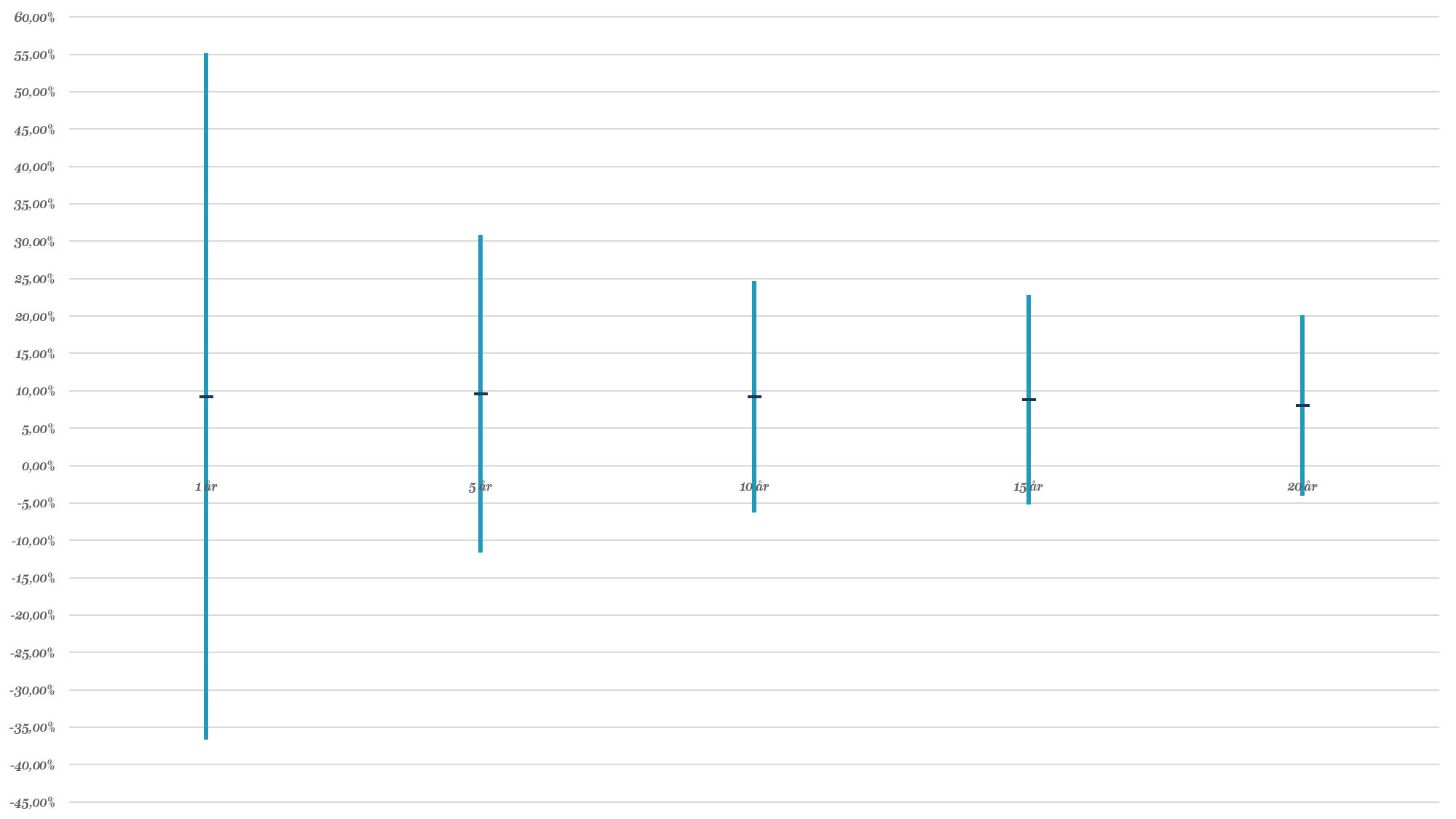 Bilden ovan visar ganska tydligt hur ”slagig” en investering med en kort horisont (1 år) är. Det kan mer eller mindre gå hur som helst.