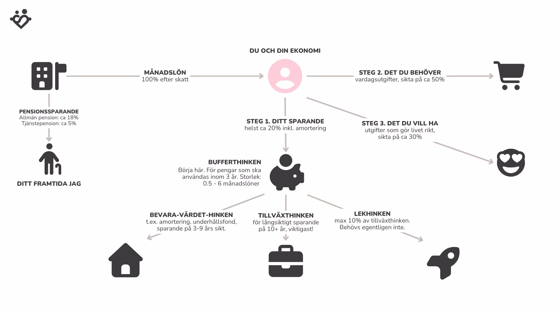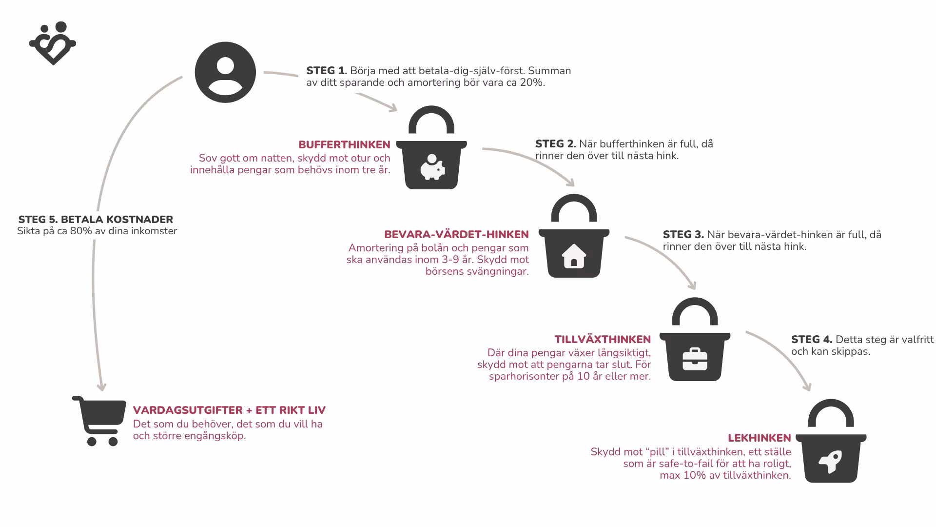 | Syfte | Skydda pengar som ska användas på kort sikt. | Skydda mot inflation och börsens svängningar. Fylla på bufferthinken. | Få pengarna att växa så att de räcker till det liv man önskar. | Få utlopp för de emotionella behoven så att man inte behöver pilla på de andra hinkarna. |