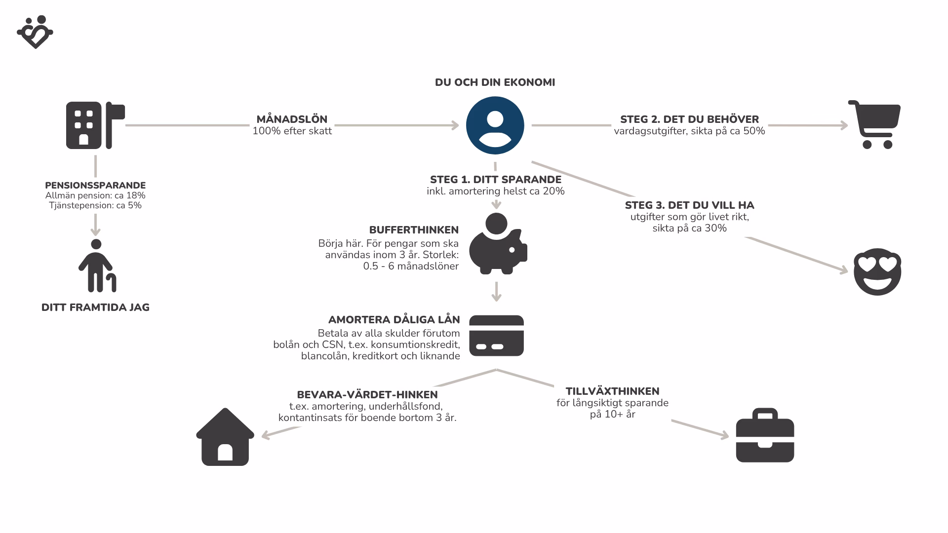 - 4. Fördela pengarna mellan bevara-värdet- och tillväxthinken baserat på sparmål (t.ex. kontantinsats).
