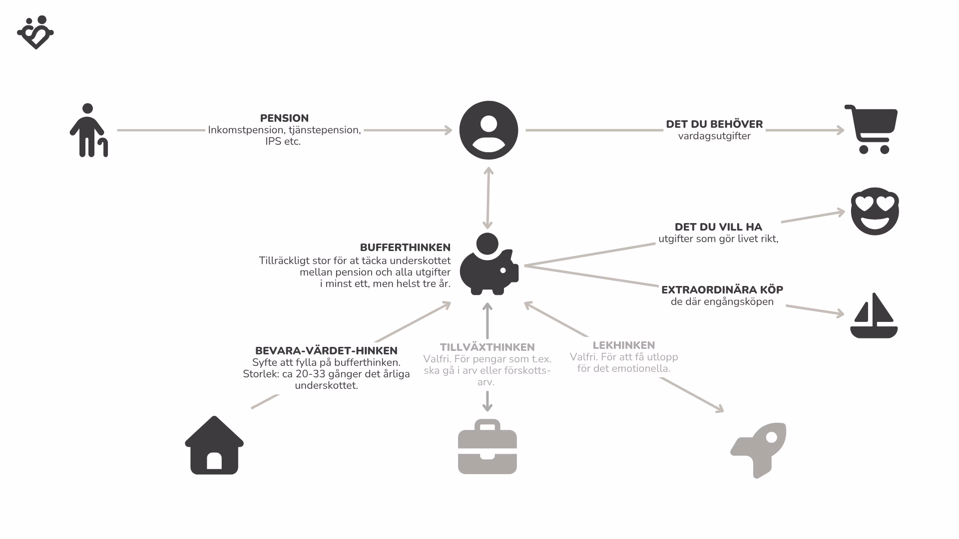 - Bufferthinken – syftet är att skydda dig och din ekonomi från oförutsedda händelser, från otur, ge dig förutsättningar att utnyttja möjligheter och omställningar i livet.