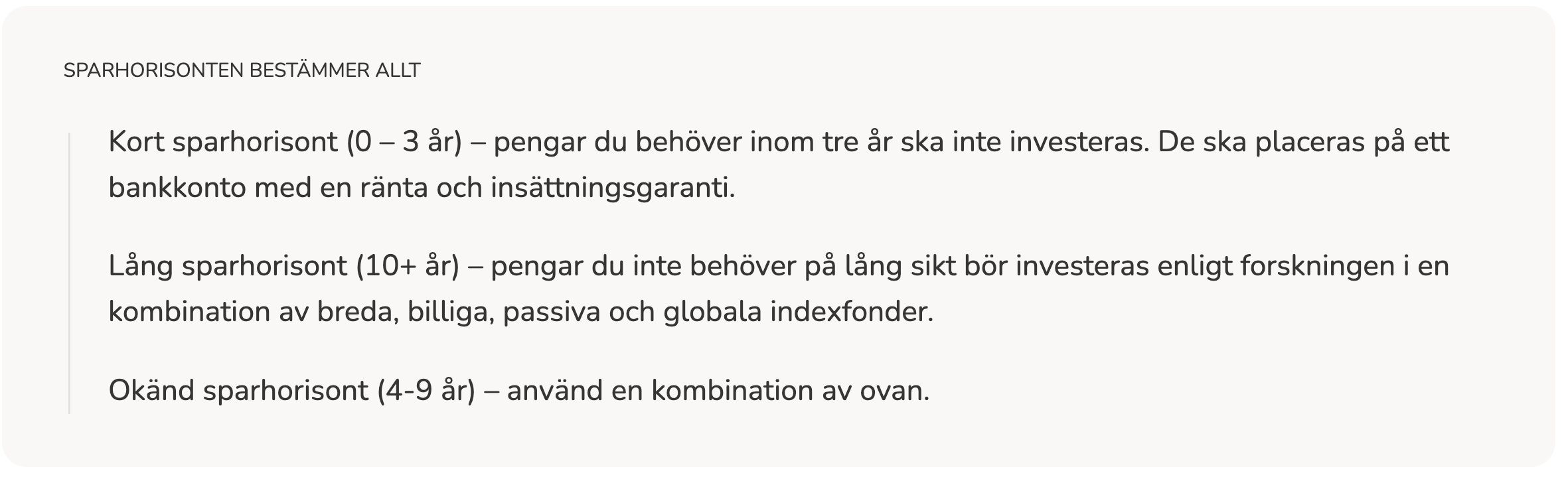 - Okänd sparhorisont (4-9 år) – använd en kombination av ovan, t.ex. 50% bankkonto och 50% indexfonder.