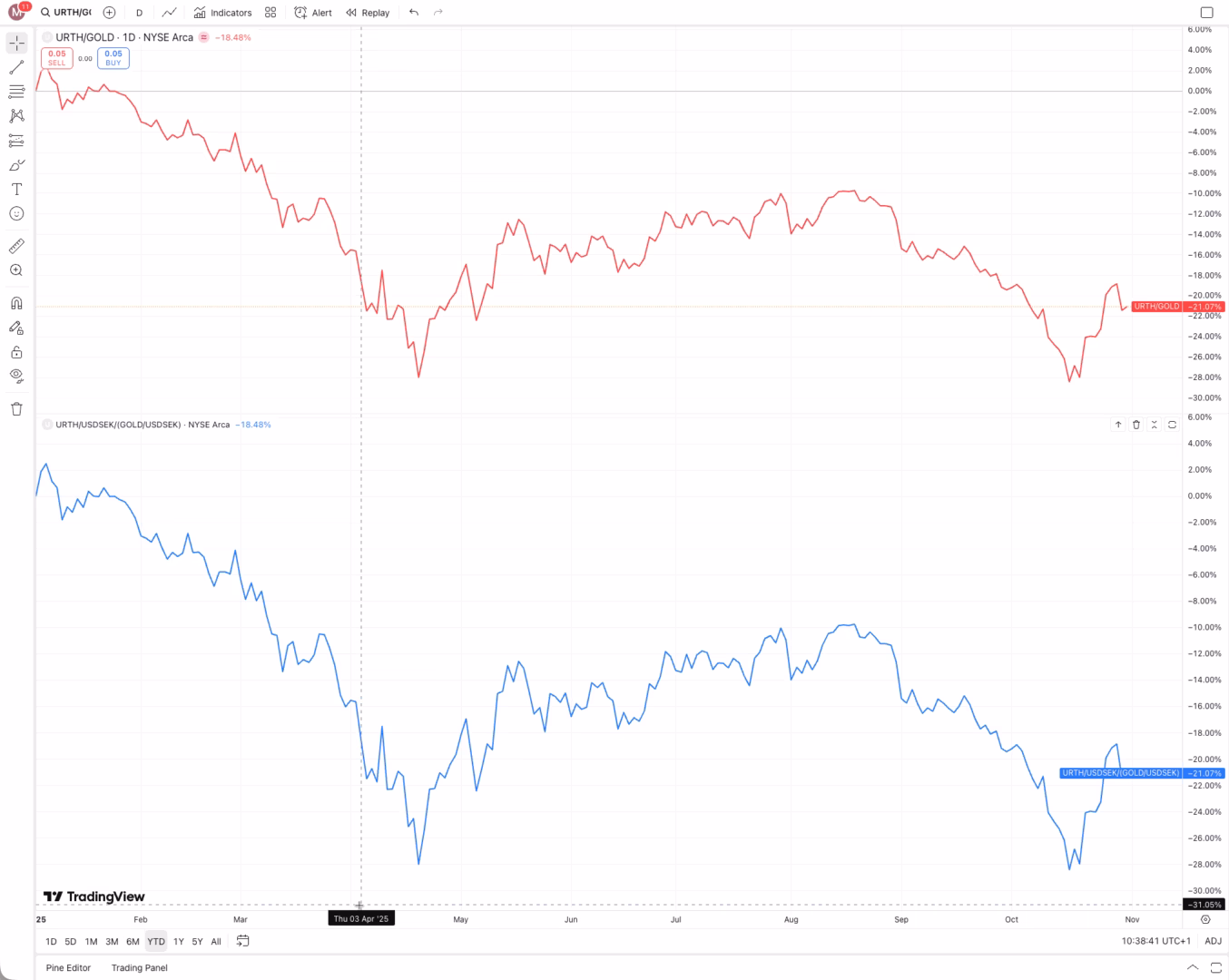 Förklaringen är att den svenska kronan har stärkts mot dollarn eftersom en stor del av en globalfond handlas i dollar. Det syns tydligt att per 22 oktober i nedanstående graf: