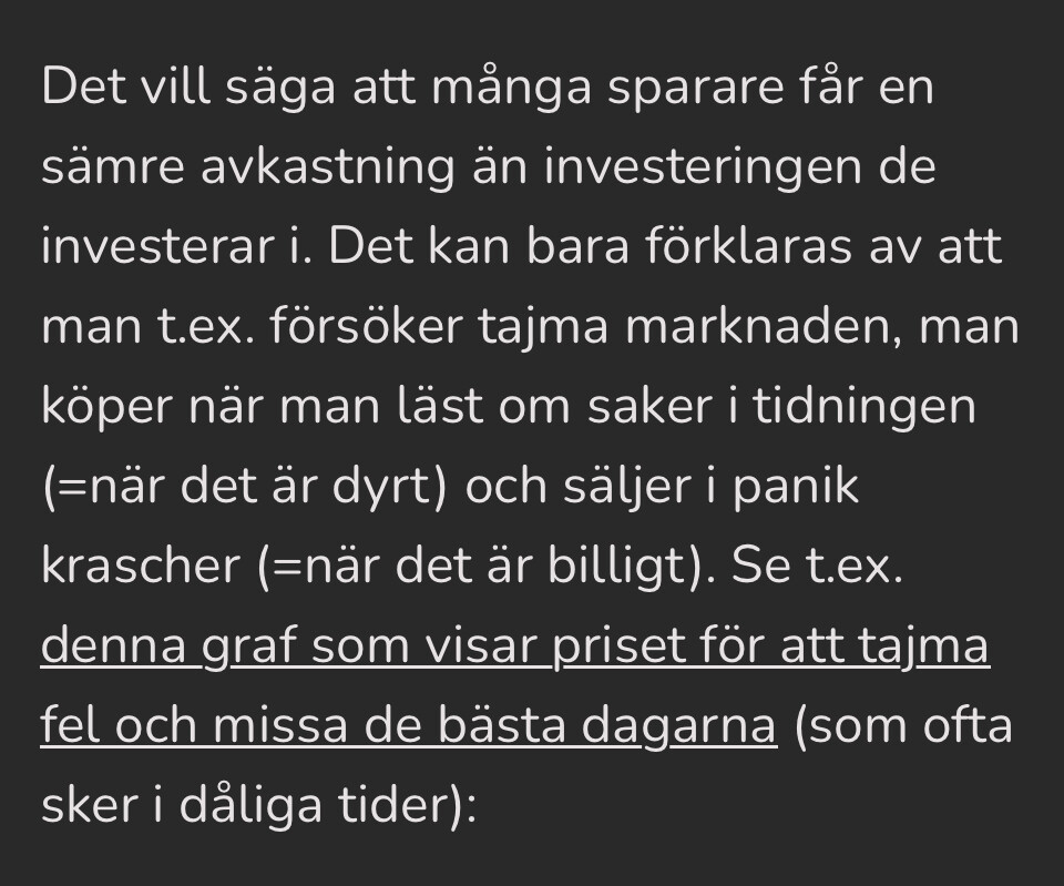 Allt text ovan handlar om marknaden och risken för nedgång. Den är viktig, men vi ska inte underskatta beteenderisken. Det vill säga risken för att vi gör något dumt och irrationellt med våra pengar till följd av rädsla (eller girighet). Studier och olika rapporter uppskattar denna risk till nästan 1-3 procentenheter per år, vilket motsvarar upp till 30% av årsavkastningen.