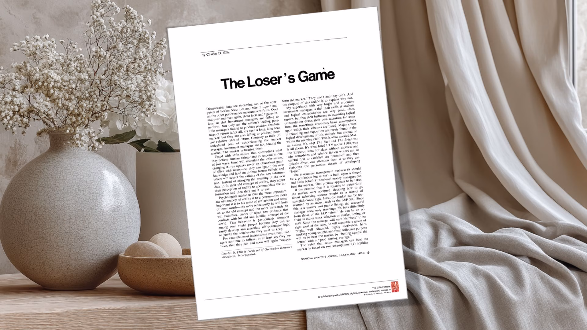 Charles Ellis revolutionerande artikel ”The Loser’s Game” från 1975 introducerade konceptet om att investeringsförvaltning förvandlats från ett vinnande till ett förlorande spel. Hans analys visar att när institutionella investerare kom att dominera marknaden – från 30% till 70% av all handel på bara tio år – förändrades spelreglerna fundamentalt.