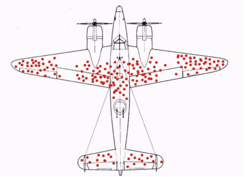 Problemet är att dem enda flygplanen som analyserades var flygplan som överlevde och klarade sig till basen. Om du tittar på bilden har inga av planen som analyserats skotthål på flygplanens mest ömtåliga delar. Cockpiten där piloten sitter, mitten av vingarna, motorerna eller den väldigt ömtåliga mittendelen av planet har inga skotthål.