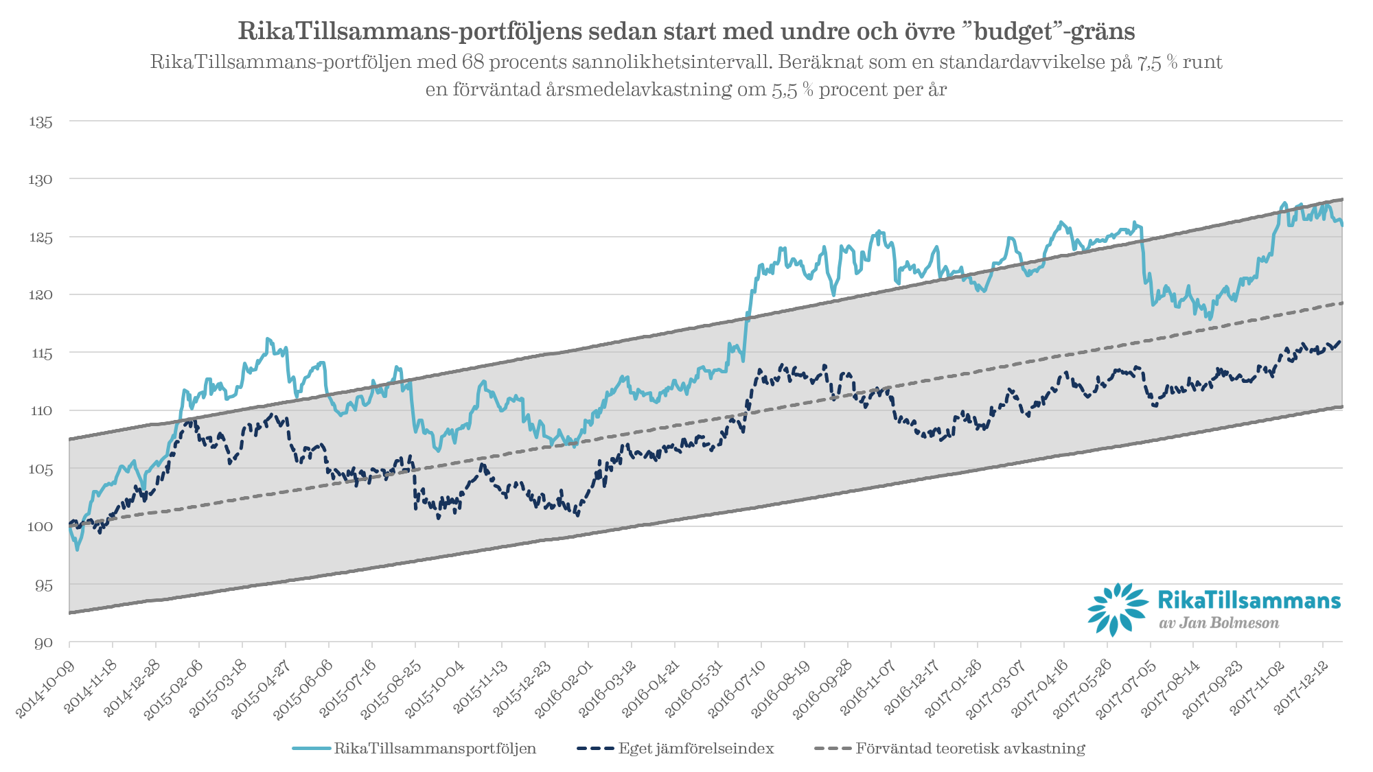 Jag pratar alltid om att man inte kan förutsäga framtiden och det är därför jag investerar på lång sikt. När jag har gjort simuleringar på RikaTillsammans-portföljen har jag konstaterat att den borde ge runt 5 procent i genomsnitt per år med en standardavvikelse på ca 7,5 procent. Det ger således en ansats att utvärdera huruvida de 3,4 procent var bra eller dåligt.