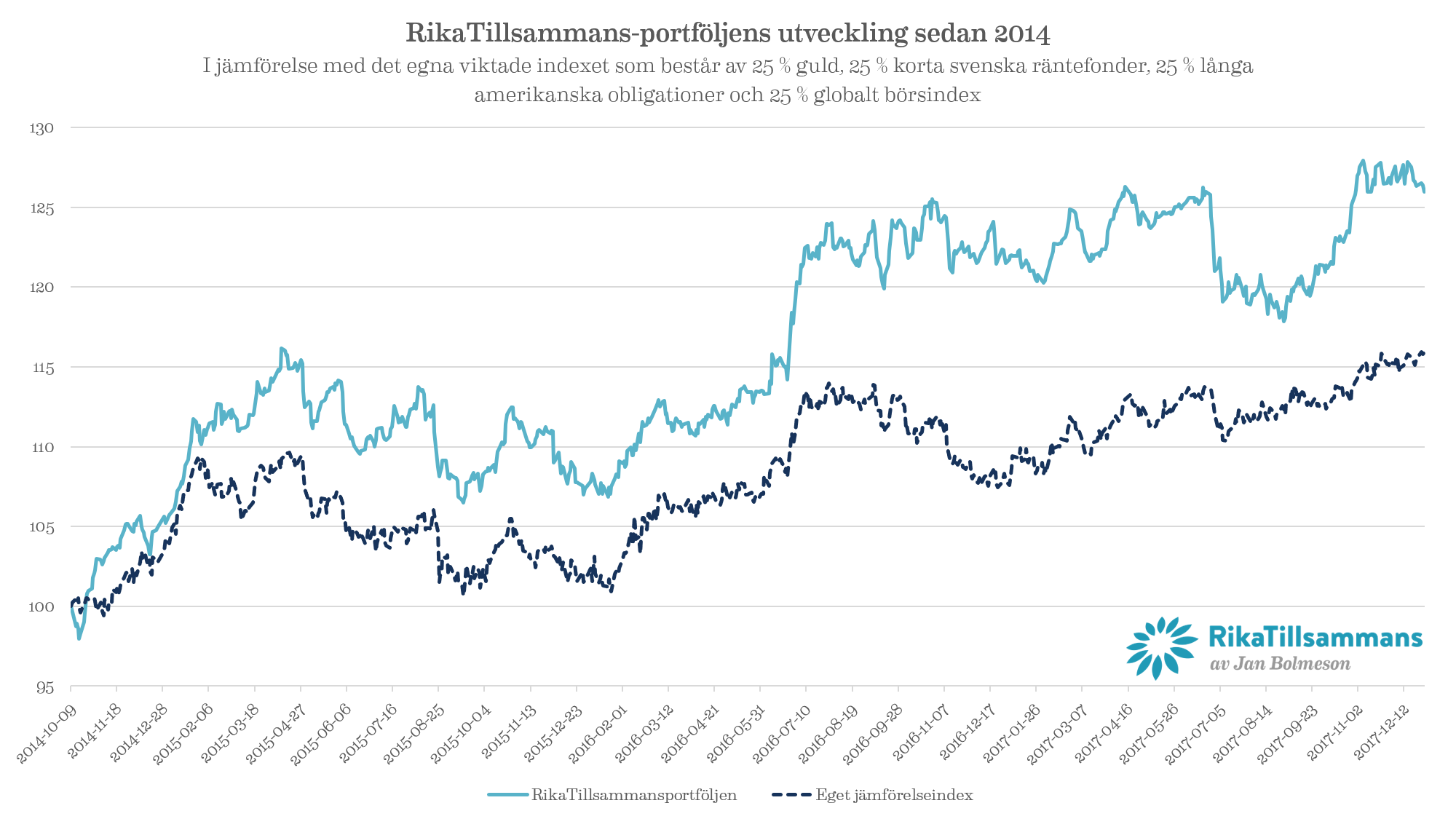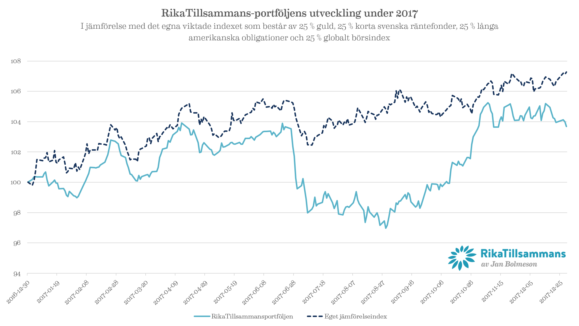 RikaTillsammans-portföljen är den portfölj som jag har haft längst. Den bygger på den klassiska ”Permanent portfolio” som Harry Browne lanserade på 70-talet och på Ray Dalios ”Allvädersportfölj”. För portföljen var 2017 ett ganska mediokert år som slutade på +3,4 procent.