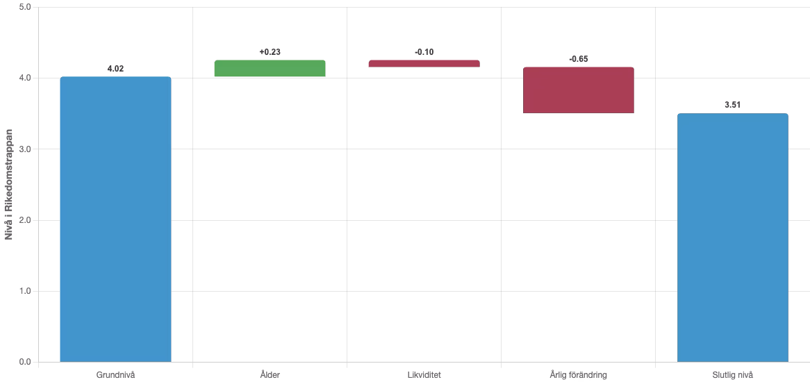 Vattenfallsdiagrammet visar hur din förmögenhetsnivå justeras baserat på din ålder, likviditet och förändring i nettoförmögenheten. Läs gärna mer nedan i "Hur har vi räknat" och framförallt om typpersonerna Anna, Martin och Jens.
