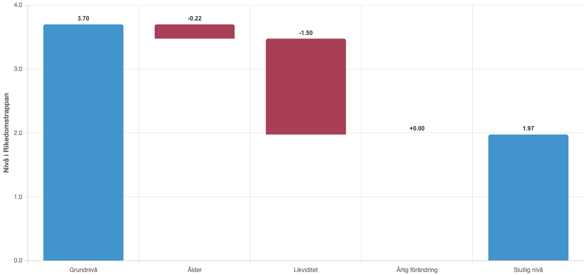 Sätter vi in alla dessa siffrorna (5 miljoner i nettoförmögenhet), 0% i likviditet, 10% nettoförmögenhet förändring samt 45 år, då visar justeringarna att de istället precis har näsan över nivå 2. Pratar man med Olof så kommer han nog beskriva den ekonomiska stressen som kan upplevas på den nivån istället för hur livet känns på nivå 3.